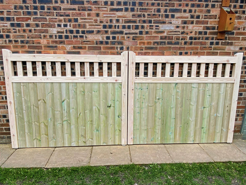 Handcrafted mortice and tenon jointed Brown Cow Board and slat entrance Gates